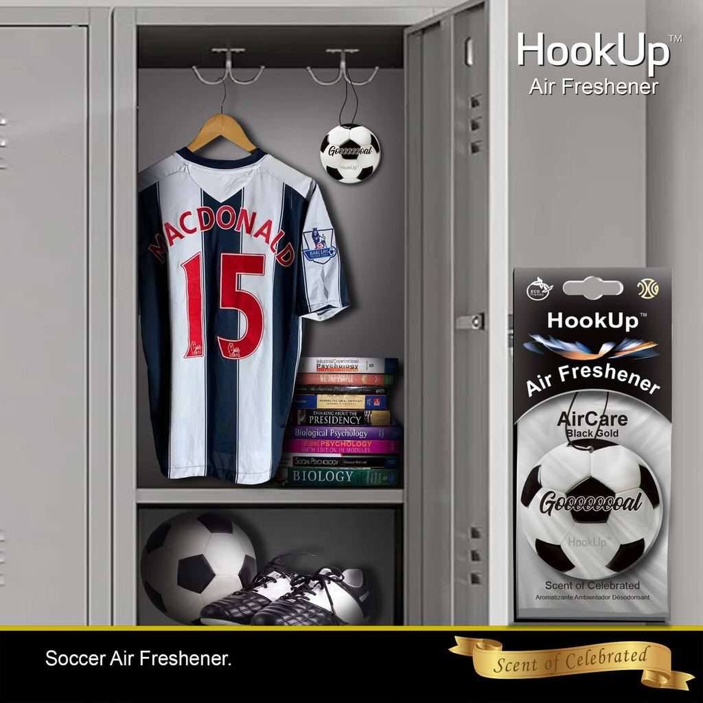•Soccer air freshener made from high quality materials. Ideal for cars, offices, homes, lockers, bags, closets, RVs, boats, and any desired spaces.